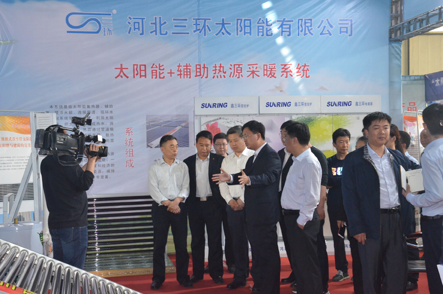 邢臺市市長董曉宇蒞臨我公司展位,我公司總經理張振杰介紹我公司新開發的太陽能+輔助熱源供暖系統。