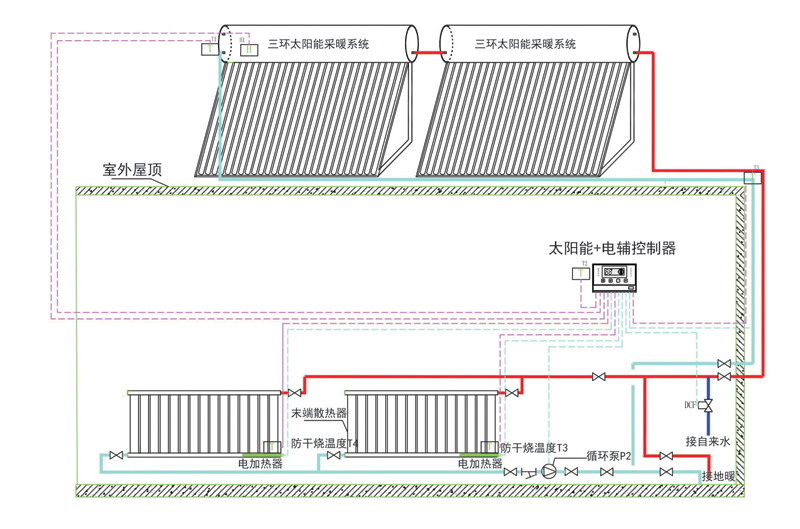本系統采用3組(或2組)30支太陽能采暖機組,通過吸收太陽能輻射能量將儲水箱內的水加熱,當太陽能溫度達到采暖設定值(默認值:45℃),啟動循環水泵將熱量運送到室內采暖末端(暖氣片或地暖),當室內溫度達到設定溫度(默認值:16℃)或太陽能水箱溫度低于采暖設定溫度時循環泵停止,該系統以太陽能熱量采暖為主,電加熱為輔的工作模式,遙控操作使用方便。優先使用太陽能熱量,當太陽能溫度不夠時自動切換到電輔加熱模式,太陽能溫度恢復后,自動切換到太陽能供暖模式。